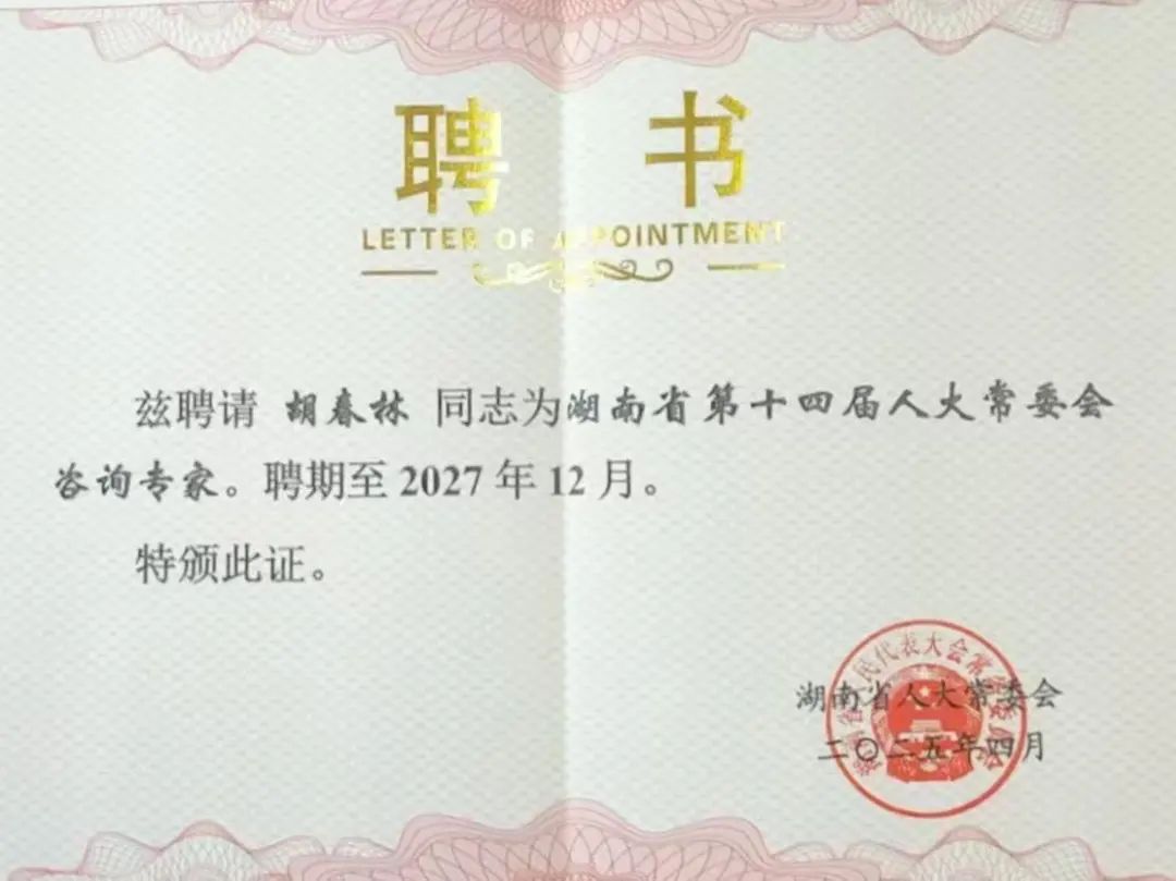 喜訊 | 胡春林董事長(zhǎng)受聘擔(dān)任湖南省第十四屆人大常委會(huì)咨詢專家